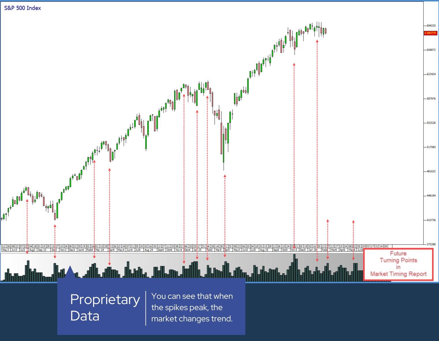 Under each market chart, you will see a histogram. This is not volume. Each histogram is essentially a time-based graph spanning the day, week or month. They work in all time frames. These spikes indicate where our cycle analysis projects a high probability of a trend change. Think of it like a heartbeat monitor for the market’s timing. A spike means something is expected to happen around that time. The higher or more numerous the spikes, the more significant the expected move or turning point. We often refer to these as Profit Finding Oracle PFO histograms because they encapsulate the output of our proprietary cycle algorithm. Most importantly, when spikes from different timeframes align, we often get major market turns. Don't worry, we do all the interpretation for you and the key dates are clearly marked in each report.